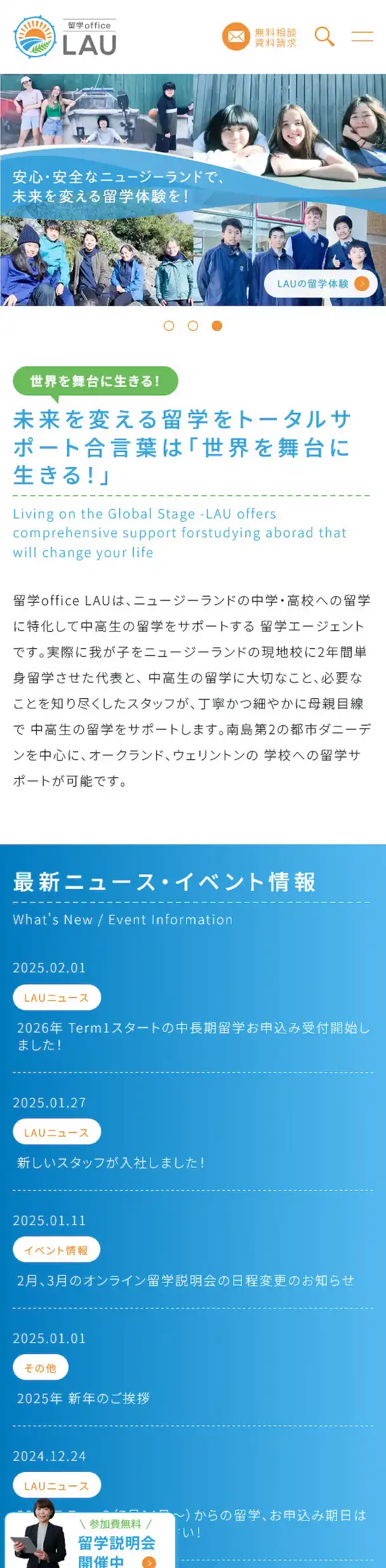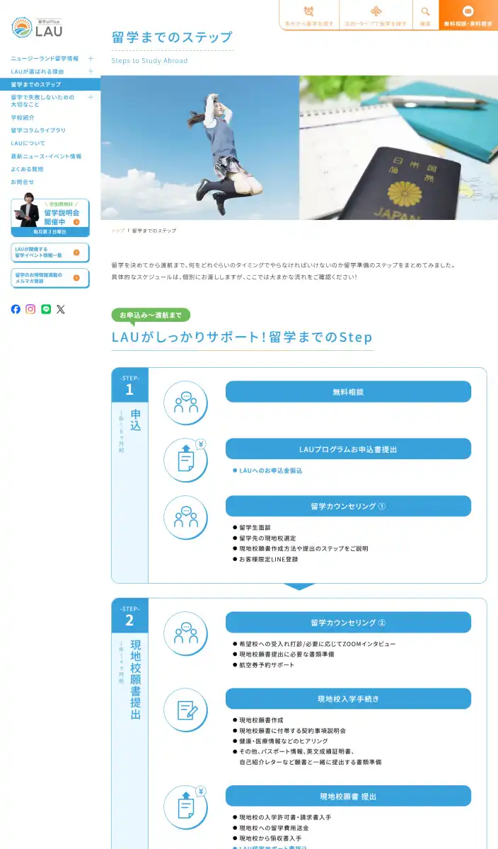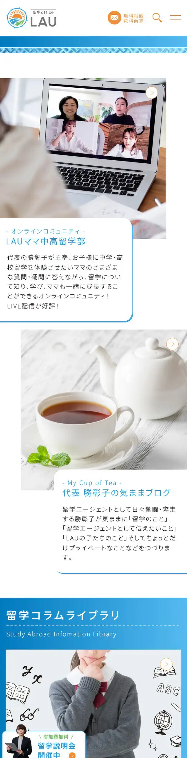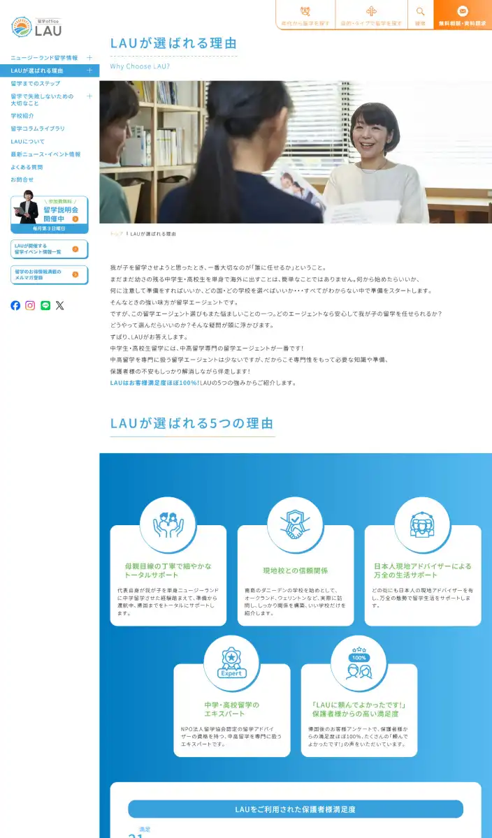 LAU様はニュージーランド留学に特化した留学エージェントです。 最初はLAU様が表現したい膨大な情報やビジョンをいかにシンプルにまとめていくかどいう作業からスタートしました。 LAUらしさを全面的に出すことが結局一番の強みだと考え、打ち合わせでは代表と一緒にLAUらしさをずっと探しました。 サイトに訪れたユーザー様にはスッキリしたデザインで出迎えることで御子様の留学準備に対する不安を和らげ、 安心感と期待を感じていただけるよう設計されています。