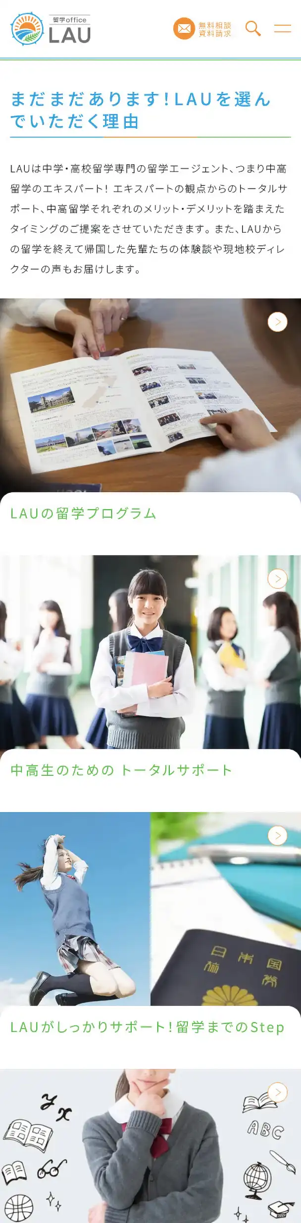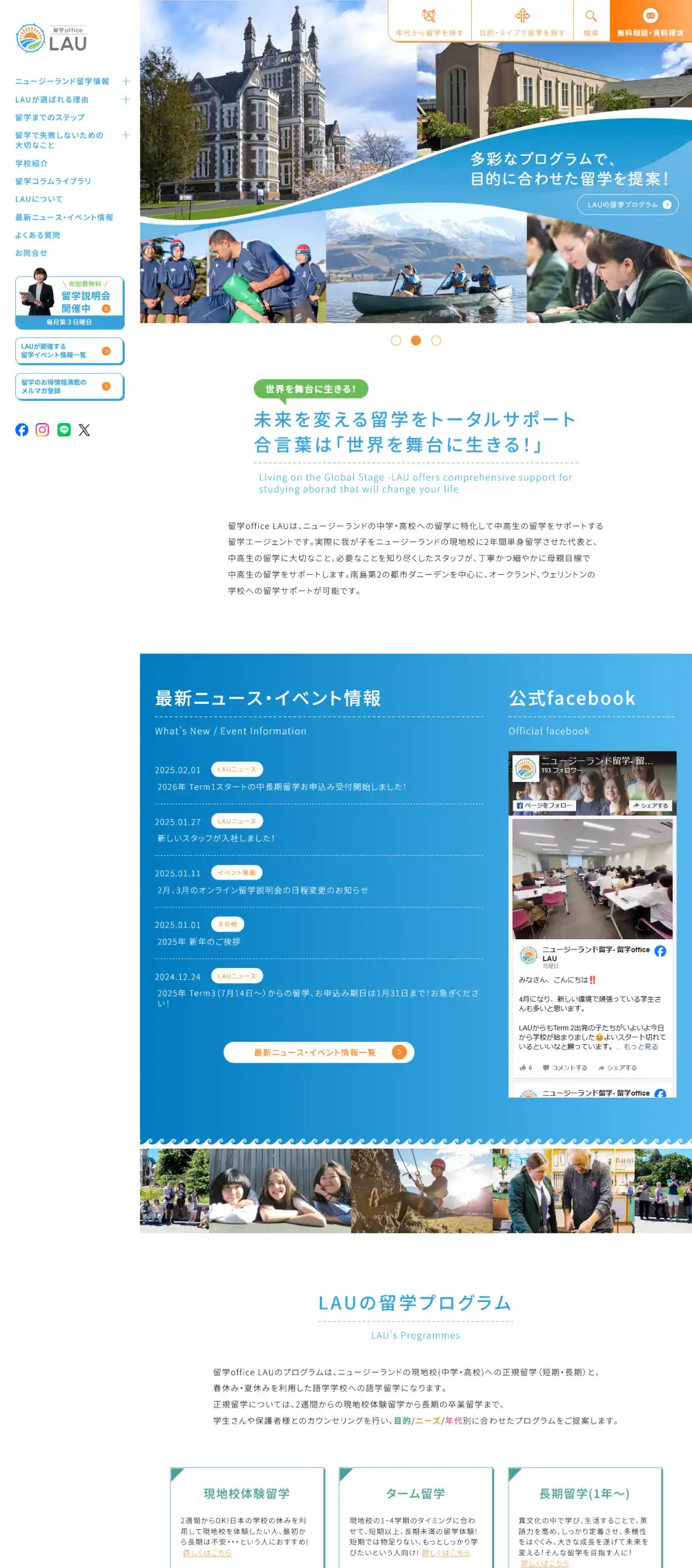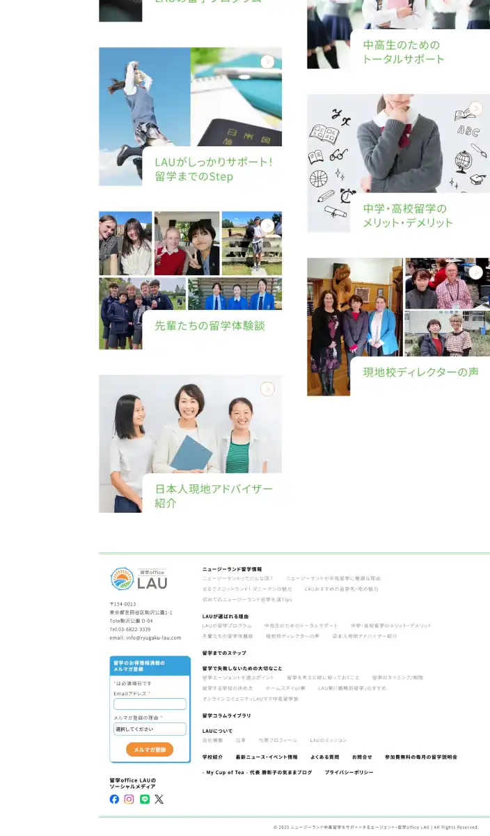 LAU様はニュージーランド留学に特化した留学エージェントです。 最初はLAU様が表現したい膨大な情報やビジョンをいかにシンプルにまとめていくかどいう作業からスタートしました。 LAUらしさを全面的に出すことが結局一番の強みだと考え、打ち合わせでは代表と一緒にLAUらしさをずっと探しました。 サイトに訪れたユーザー様にはスッキリしたデザインで出迎えることで御子様の留学準備に対する不安を和らげ、 安心感と期待を感じていただけるよう設計されています。